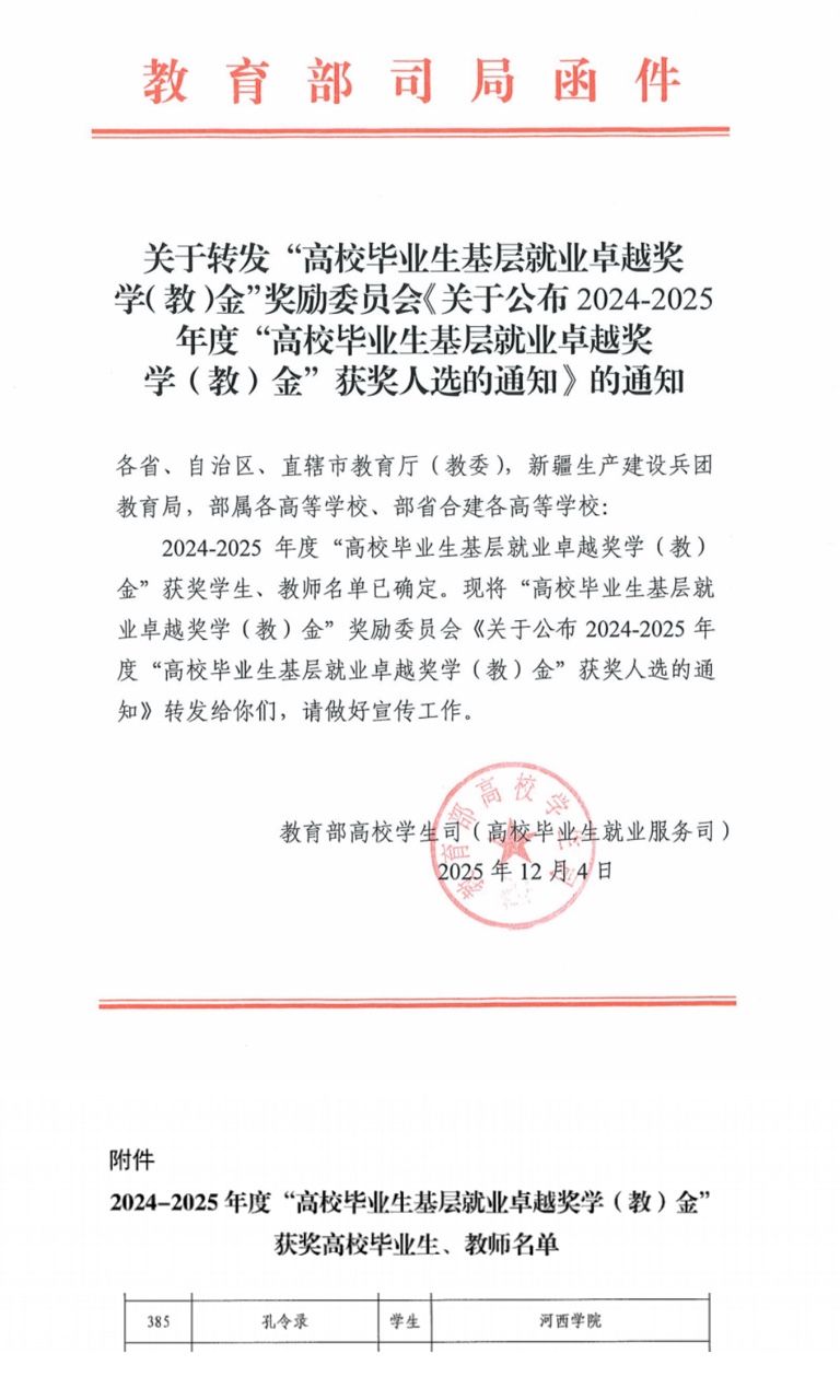 学院校友孔令录荣获 2024-2025年度“高校毕业生基层就业卓越奖学金”