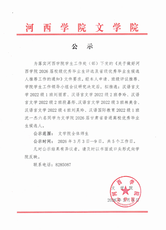 文学院2025年度“甘肃省高校三好学生”候选人推荐公示