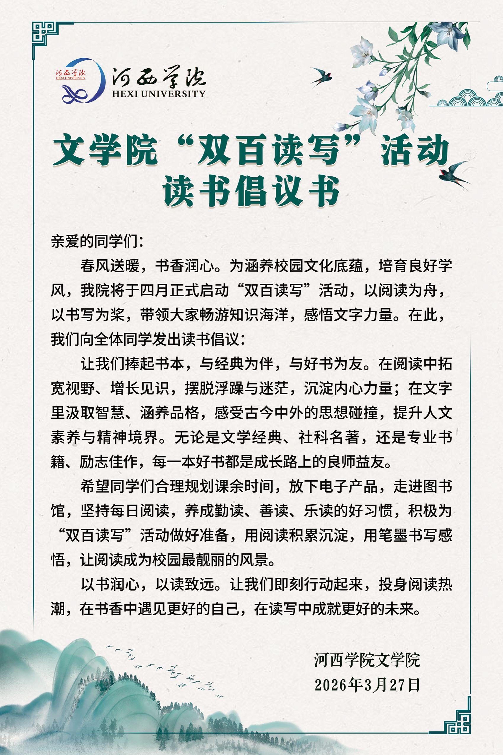 文学院”双百读写“活动读书倡议书