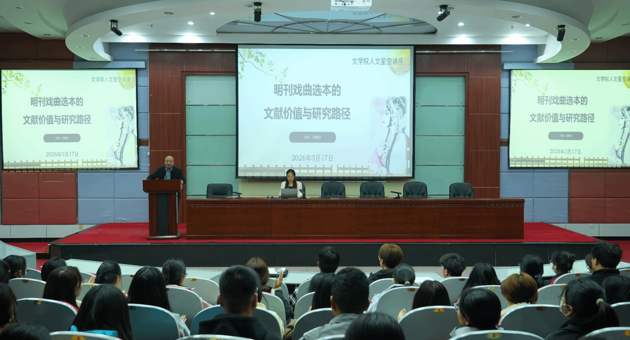 2026年3月17日晚19:30,河西学院文学院本学期首场“人文星空”学术讲座在图书馆学术厅顺利举行。本次讲座由文学院教授、硕士生导师、丝绸之路戏曲与民间文化研究中心负责人刘梅兰主讲,主题为“明刊戏曲选本的文献价值与研究路径”,百余名师生到场学习并交流。