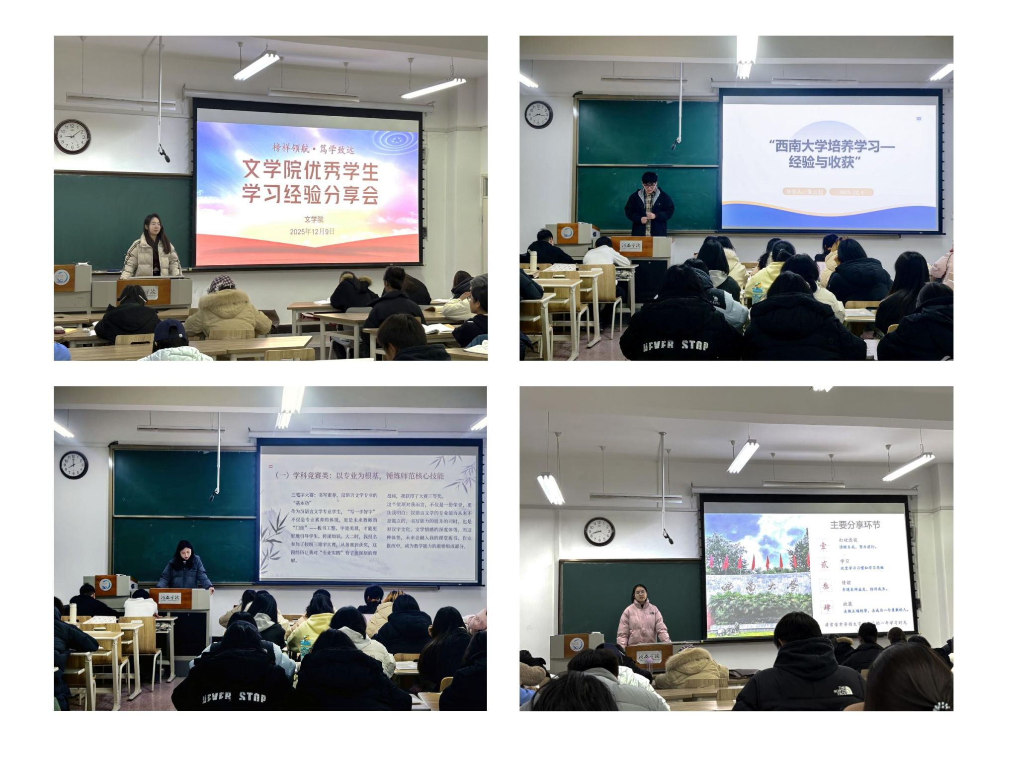 近日,学院组织优秀学生代表走进25级各班,开展学习经验分享报告会,为新生答疑解惑、指引方向。本次活动邀请3名国家奖学金获得者和2名西南大学联合培养返校学子担任主讲人。国奖获得者结合自身经历,围绕四六级备考、第二课堂实践、专业课学习等新生关切问题,倾囊相授实用技巧;联合培养学子分享跨校求学的探索历程与成长感悟,助力新生明晰学业规划。活动现场互动频繁、氛围热烈,新生们认真聆听记录、积极提问交流,纷纷表示收获满满。...